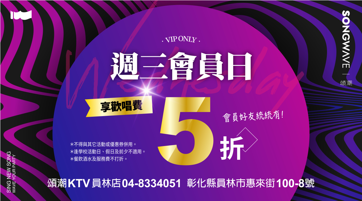 加入好友,會不定時發放好康訊息 及專屬限定優惠! ※本活動逢學校活動日、假日及前夕不適用。 頌潮KTV員林店 官方帳號LINE:@songwavektv 24H訂位洽詢專線:04-8334051