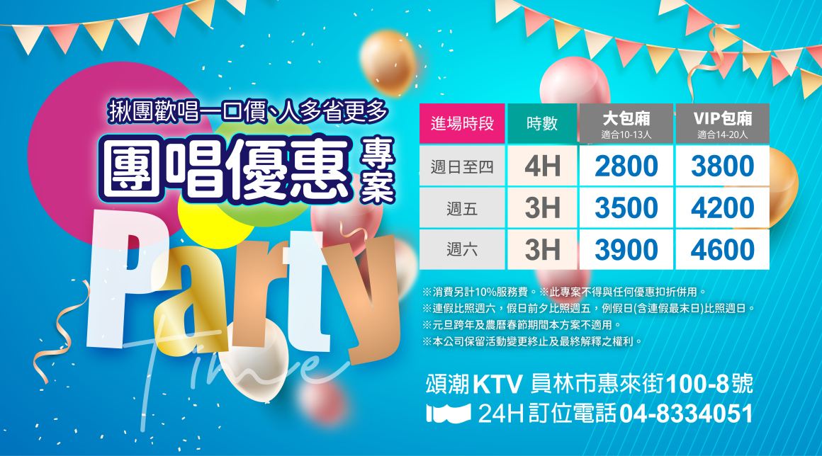 不限人數歡唱到底~人多省更多! 快、快、快~揪閨蜜麻吉們一起嗨! 歡迎來電洽詢訂位,不定時推出專屬限定優惠! ※連續假日比照週六,假日前夕比照週五,例假日(含連假最末日)比照週日。 ※特殊節日、跨年夜及農曆新年期間,本活動暫停。 頌潮KTV員林店 官方帳號LINE:@songwavektv 24H訂位洽詢專線:04-8334051